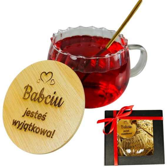 2. Pokrywka z naturalnego bambusa (100%) - z trwałym grawerem: „Babciu jesteś wyjątkowa!”