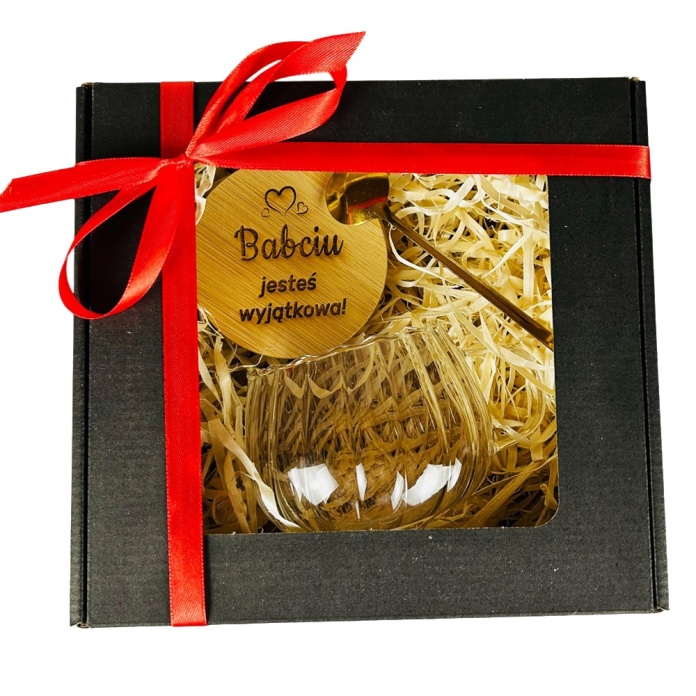 W komplecie znajduje się czerwona wstążka, dzięki czemu prezent jest gotowy do wręczenia od razu po zakupie – bez biegania po papier i taśmę.