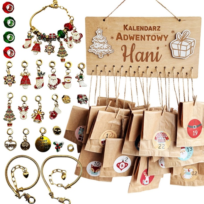 💫 Kalendarz Adwentowy Biżuteria z Własnym Imieniem – Bransoletka i Zawieszki dla Dziewczynki