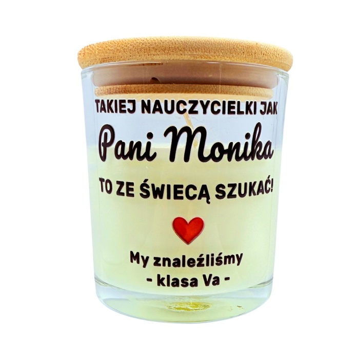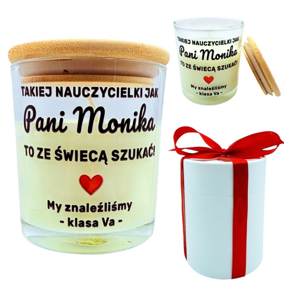Szukasz eleganckiego i personalizowanego prezentu dla nauczyciela czy wychowawcy? Ta roślinna świeca zapachowa z nadrukiem to wyjątkowy sposób, by wyrazić wdzięczność i podziękowanie nauczycielowi w dniu jego święta. Wystarczy podać imię nauczyciela oraz podpis wręczających (np. Pani Monika, Klasa Va), aby stworzyć upominek pełen emocji i wspomnień.