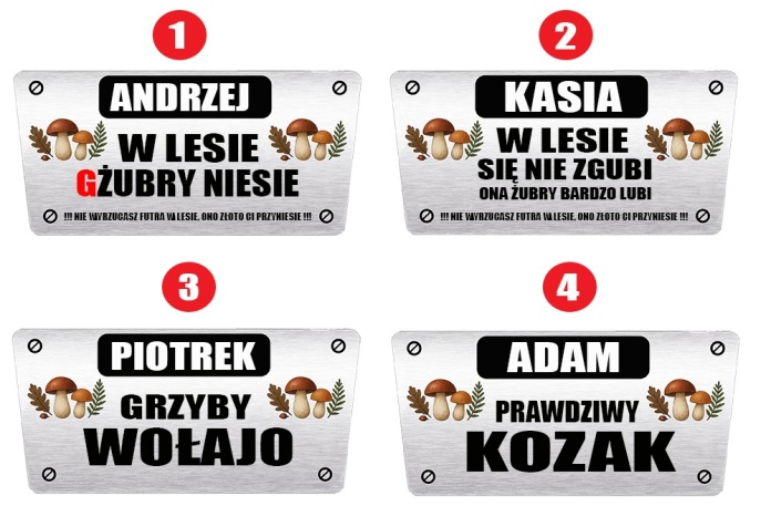 • Miejsce na personalizowaną naklejkę z imieniem – np. „JANUSZ”, „TATA”, „SZWAGIER” – do wyboru jeden z 4 wzorów z napisem, np. „W lesie GŻUBRY niesie”