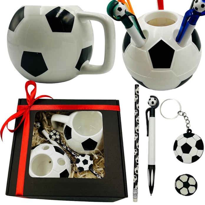 ⚽ Zestaw 7w1 Prezent dla Piłkarza – Kubek, Przybornik, Długopis, Brelok, Ołówek, Gumka
