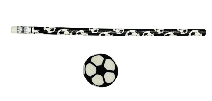 Klasyczny ołówek ozdobiony motywami piłki nożnej, zakończony gumką do mazania.
