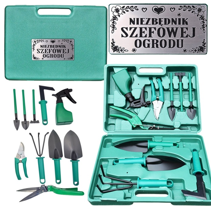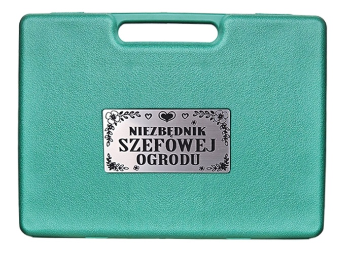 Całość zapakowana w solidną, zieloną walizkę z elegancką srebrną tabliczką i grawerem „Niezbędnik Szefowej Ogrodu”. Prezent gotowy do wręczenia od razu!