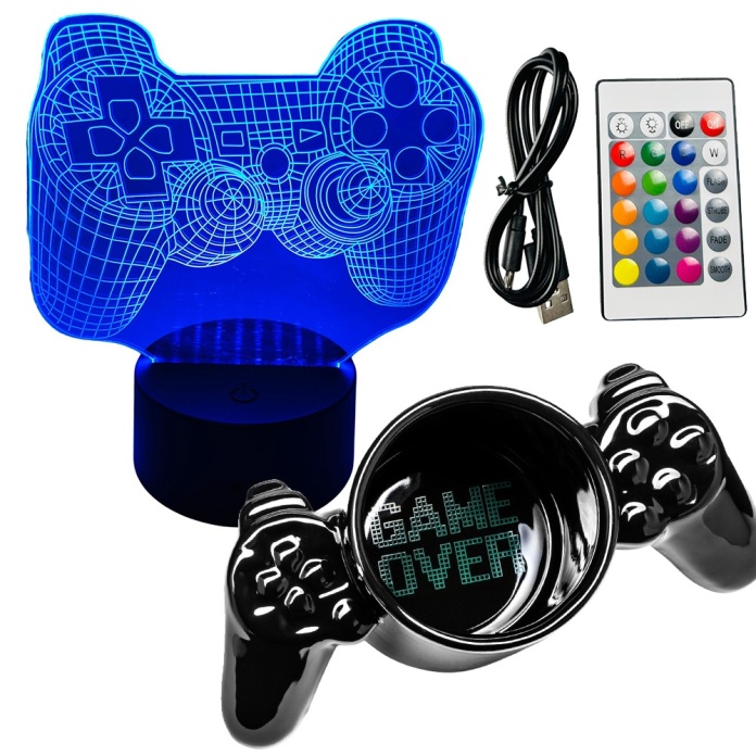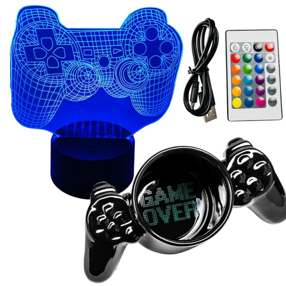 Zestaw, który pokocha każdy fan gier – oryginalny kubek w kształcie pada i efektowna lampka 3D LED z pilotem. Połączenie praktycznego gadżetu i designerskiej dekoracji w jednym!